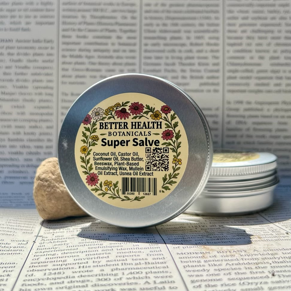 Super Salve is a rich, herbal-infused ointment designed to repair and protect skin in need of healing. Infused with time-honored herbs like mullein and usnea, this formula supports your skin’s natural healing process while offering a soothing, antimicrobial moisture barrier.
